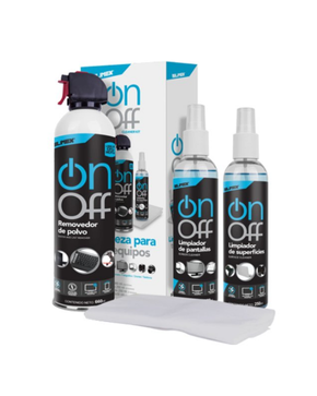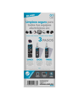 KIT LIMPIEZA ON-OFF SILIMEX, Aire 660ml Locion superficies 250ml, Limpia Pantallas 250ml y 2 Microfibras